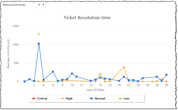 Explanation of Extremes: Often, there are 'outliers' in open tickets; for example, if 150 tickets were closed in the last 30 days, the vast majority may have been resolved in 2 days. However, in the case where perhaps 3 of those tickets were resolved in 90 days, this would disproportionately skew the statistics. Rather than showing a 'realistic' average of 2 days, the actual statistic of almost 4 days, which is not a true representation of activity, would be displayed. In this example, changing the Remove Extremes drop-down menu to 3, would correct the skew.