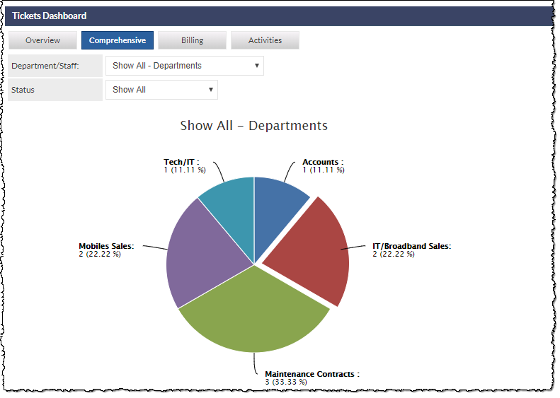 The Comprehensive chart is a pie chart, detailing the percentage of tickets based on the filter selection; for example, percentage of tickets allocated to each ticket department, ticket status, etc.