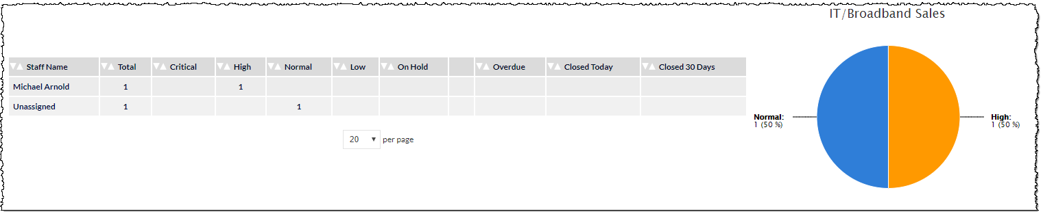Clicking a chart segment drills-down, into the selected data. For example, when the filters are set to show a specific staff member, and all ticket statuses, clicking on a chart segment will display a list, below the chart, showing ticket statistics for the selected staff member.