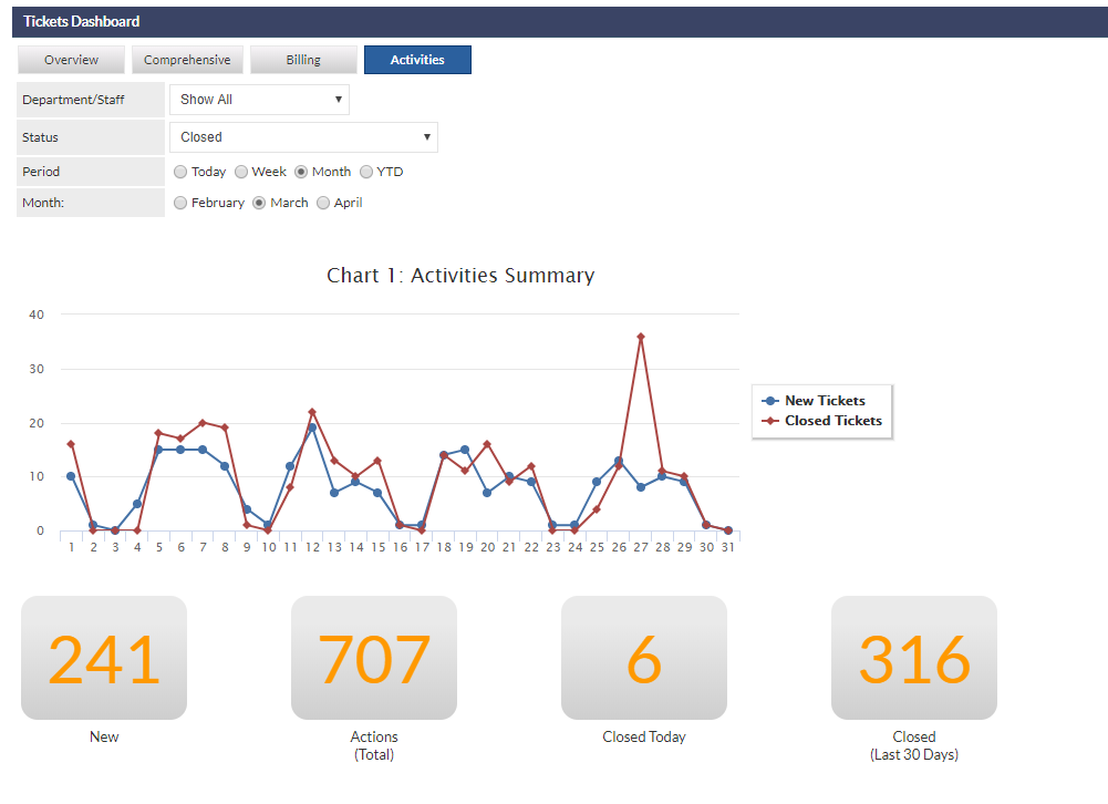 The Activities section of the Tickets Dashboard presents a line chart and summary tiles, relating to ticket activity, i.e. new or closed, or updated tickets.