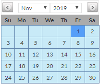 If a date has previously been selected, the calendar will display the year and month in which that date occurs, with the specified date highlighted (e.g. 1st November, 2019 in the above image).