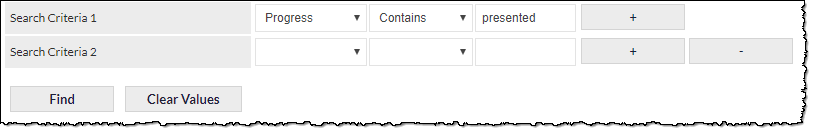 In the above image, in addition to any of the main search criteria that may have been specified, listed leads must also have a Progress item selected, that contains the text presented. The button adjacent to Search Criteria 1 has been clicked to present the second criteria fields.