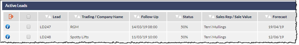 - In the Active Leads section (the final section in the Leads screen), select one or more leads by ticking the box in the second column. You can select / deselect all leads on the page by ticking / unticking the box in the second column-header.