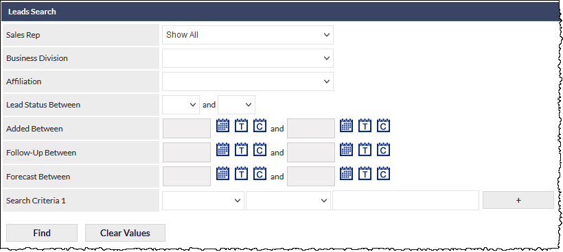 Up to five additional criteria can be specified for the lead search. Initially, only one additional criterion is visible, but additional criteria may be added by clicking the button, or removed by clicking the button.
