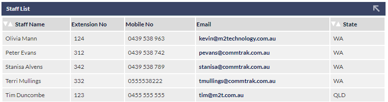 The CallTrak Staff List is your organisation's company directory, and can be accessed from the CommTrak Main Menu, or by clicking the CallTrak tab at the top of a Customer Screen.