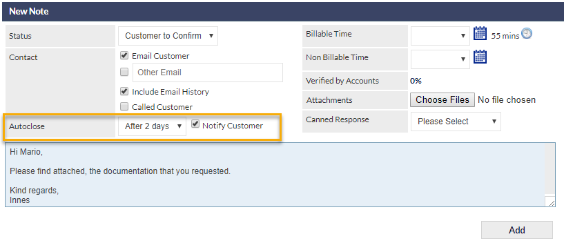 The Autoclose feature is automatically cancelled in the event that any additional notes are added to the Ticket, either manually, or via a Customer's response to a Ticket email.