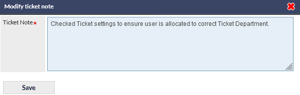 Pressing Add will also confirm any unsaved fields in the main Ticket section of the window. For example, if the Department field has been modified, the changes will be saved when the Add note button is pressed.