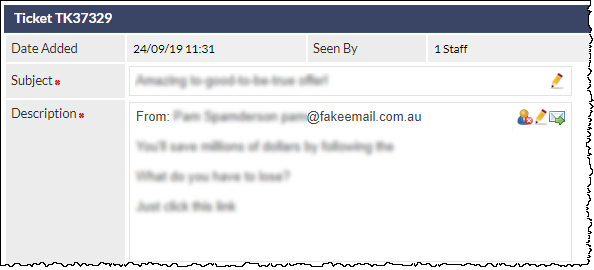 For information about additional features available when viewing a Ticket, see Support Centre article Viewing a Ticket.