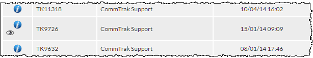 If another CommTrak user is currently viewing a Ticket, this is indicated in the Active Tickets list by the display of the Currently opened by... (eyeball) icon, which will be located next to the more info (i) icon to the left of the Ticket item: