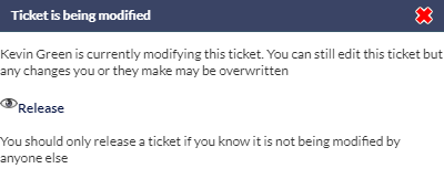 If the Ticket is viewed when currently opened for viewing by another CommTrak user, the Ticket will be displayed, which is the normal behaviour; however, the Ticket is being modified pop-up window will be displayed, showing the name of the other CommTrak user, along with a Release link. If the Release link is pressed, the Ticket will no longer be marked as being viewed by the other CommTrak user.