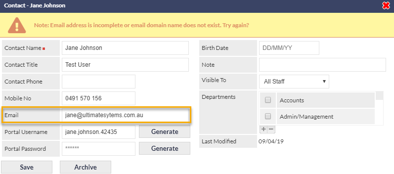 If an invalidly-formed email address is provided, CommTrak will not allow it to be saved.
