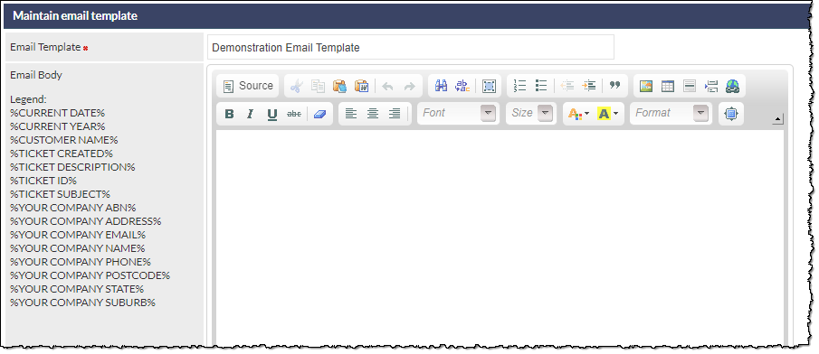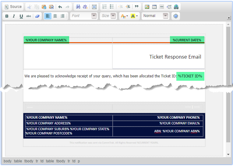 The CommTrak HTML editor is intended to be used for making minor adjustments to professionally-designed HTML templates. It is recommended that ticket email templates are initially created by an HTML design professional (e.g. web developer).