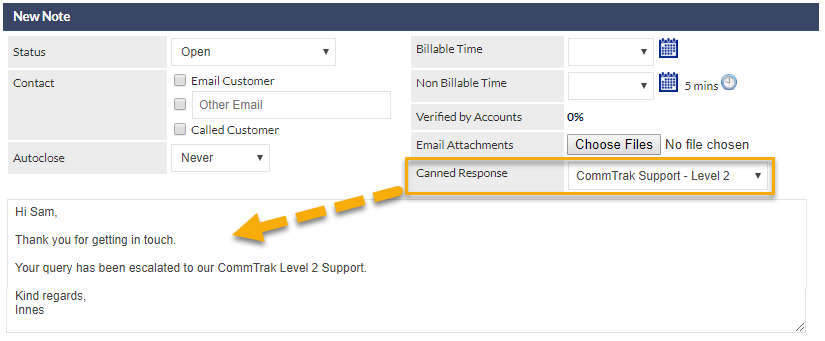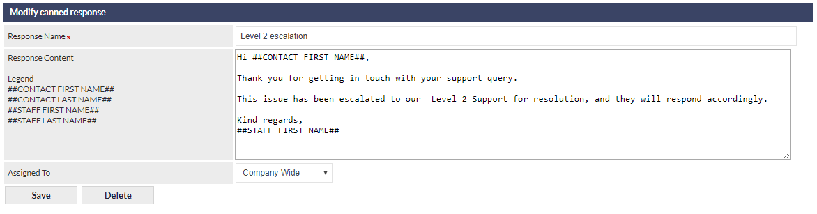 Canned Responses are predefined messages which, when selected, automatically populate a Ticket Note field with the specified text. This feature enables the provision of a library of ticket responses, which can be selected from a drop-down list for use in internal ticket notes, or for emailing to contacts,.