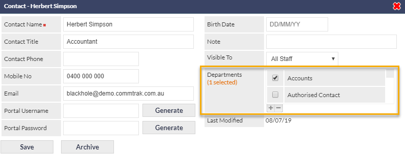 The Contact Departments field enables users to specify which department(s) a contact represents within the contact's organisation: