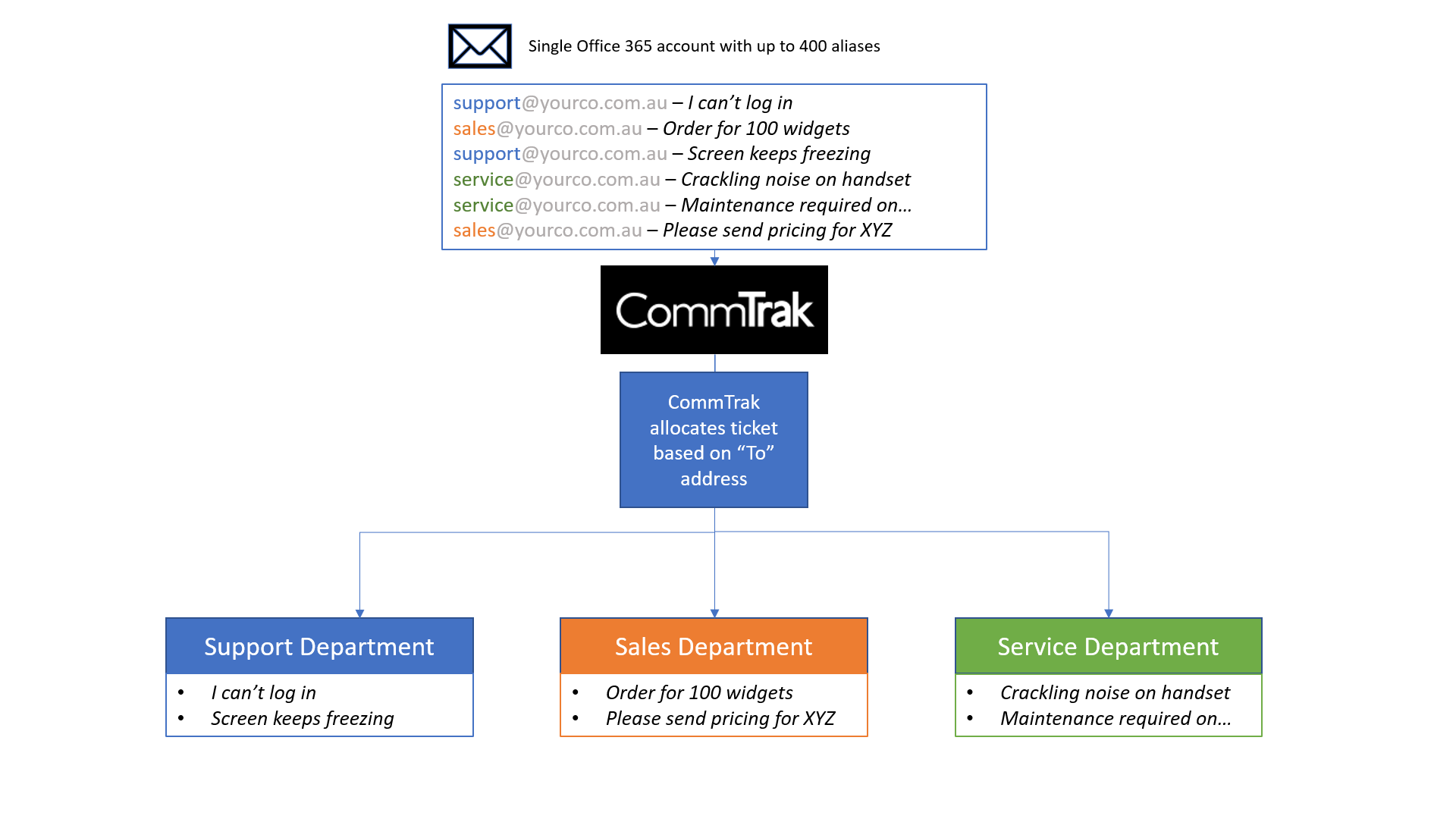 This section refers to a known limitation pertaining to the way in which Microsoft 365 alias email addresses are managed within CommTrak, when an email is sent to a Ticket alias email address from within your organisation's MS365 email domains. Emails sent to alias email addresses from outside your organisation's MS365 email domains are not affected by this limitation.