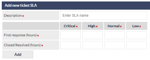 - Enter the response and resolved / closed times (in hours), into the fields for each ticket priority (all fields are mandatory)