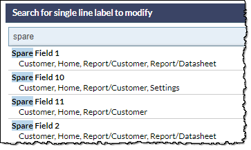 Note, in the above image, the screens on which the label appears are listed below each search result. For example, the label Spare Field 1, can be found on the following screens: Customer, Home, Report/Customer and Report/Datasheet.