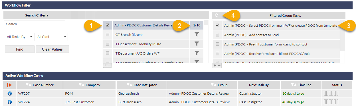 In the above image, a single Workflow Group has been ticked (1), the filter icon next to group has been clicked (2) (now displaying the number of selected tasks), and a single workflow task has been ticked (3), thus limiting the Active Workflow Case list to only show workflows where the selected task is the next due task.