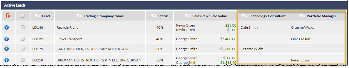 The following image shows an extract from the Leads screen, with two Relationship Manager columns enabled (Technology Consultant and Portfolio Manager).