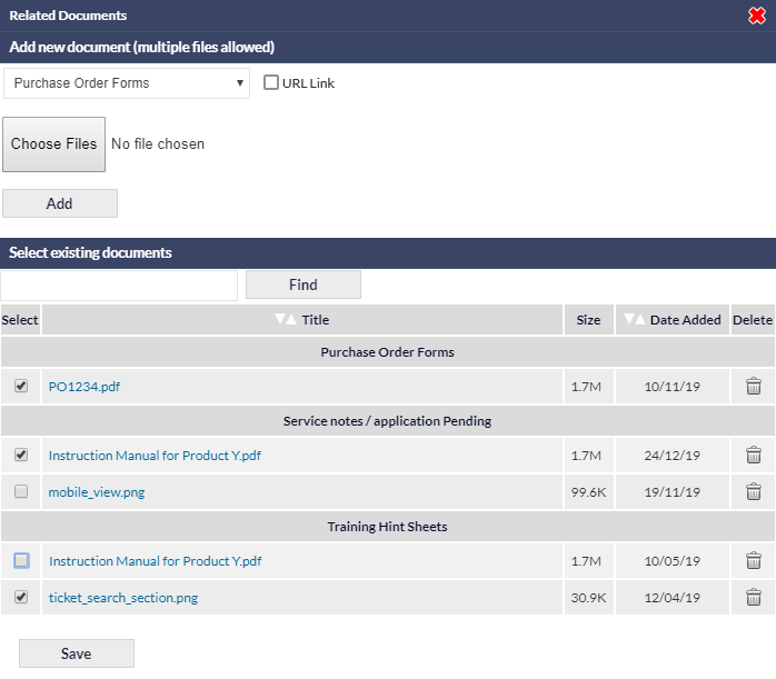 In the bottom section of the Related Documents pop-up window, entitled Select existing documents, place a tick next to each document that is to be related to the current item, and press Save.