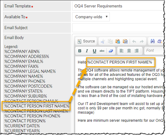 The above image demonstrates how the %CONTACT PERSON FIRST NAME% placeholder has been implemented in the body of a Leads email template.