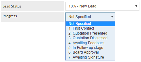 Items in dropdown lists are always displayed in alphanumeric order. Typically, Lead Progress Types are required to be displayed in a specific order, to denote progress throughout the Lead process. It is recommended that the description provided for the Lead Progress Type should be proceeded with a number, which will ensure that it is positioned correctly in the Lead Progress dropdown list on the Lead screen, as shown in the following image: