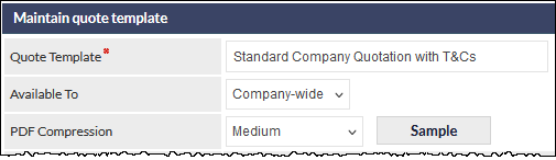 In some cases, a higher level of compression can reduce the quality of images in the resulting PDF. To aid in determining an appropriate level of compression, there is a Sample button; this will generate a sample PDF based on the Quote Template, so you can view the resulting PDF and confirm that the quality is appropriate for your requirements.