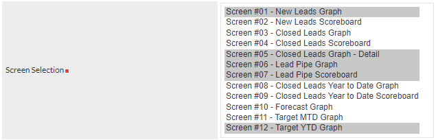 Select the screens to be displayed in the Standalone Dashboard; multiple screens can be selected by clicking the screen names in conjunction with the Shift and / or Ctrl keyboard keys.