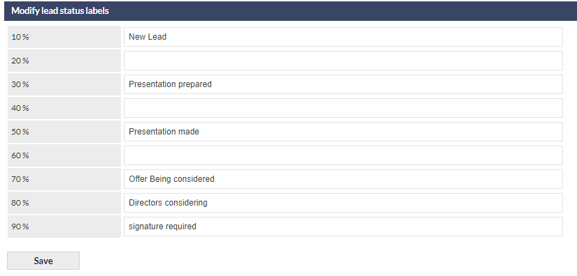 The Leads Status Labels are optional text descriptions that can be displayed adjacent to the Lead Status percentages. The following image shows an example of Lead Status Labels: