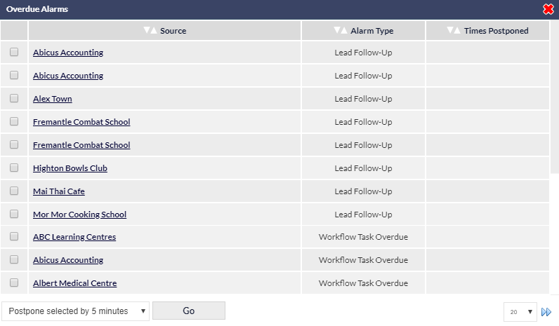 When the postponement period has expired, the activity will be displayed in the Overdue Alarms pop-up window, and the number of times that the activity has been postponed will be displayed in the Times Postponed column.