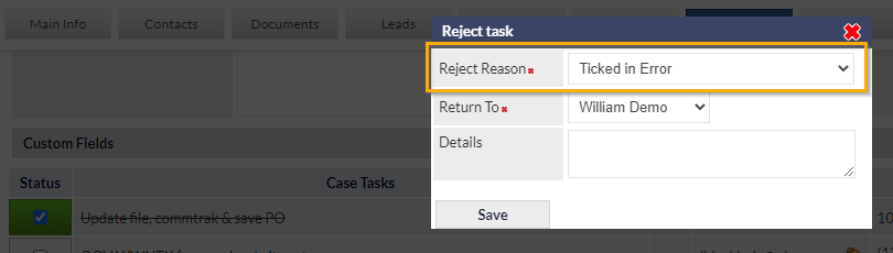 - Select a Workflow Task Rejection Reason from the list displayed at the top of the settings screen