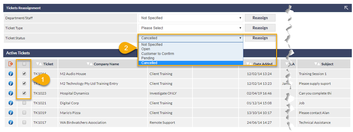 This article focuses on bulk-reassigning the Status of active Tickets. For more information pertaining to the Active Tickets screen (including bulk-reassignment of other Ticket attributes), please see the Support Centre article, Active Tickets Screen.
