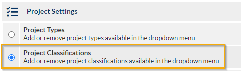 - Select a Project Classification from the list displayed at the top of the settings screen