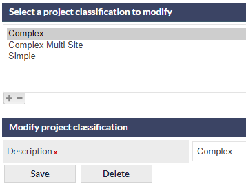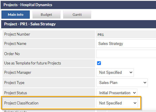 Project Classifications are used to categorise Projects for the purposes of filtering and reporting. When a new Project is created, the Project Classification defaults to Not Specified, and can subsequently be specified when viewing the Project, by selecting the required item from Project Classification dropdown list.