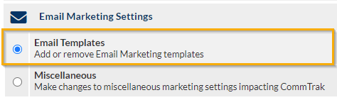 This setting is used to configure email templates that can be used for sending Email Marketing campaigns from CommTrak's Email Marketing module.