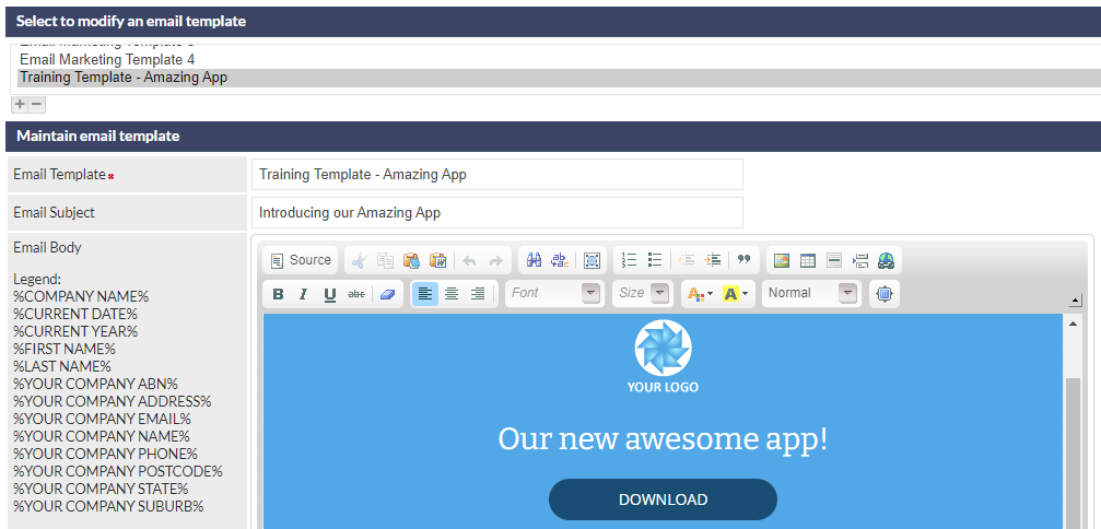 - Edit the fields as required (refer to the available fields in the above article section, Add an Email Marketing Email Template)