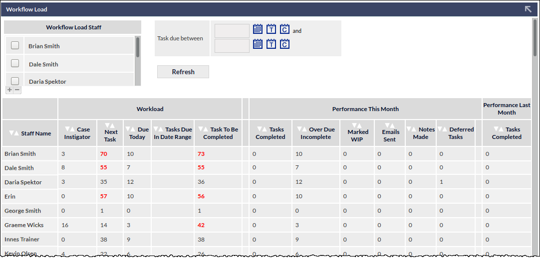 Workflow Loads that exceed a predefined limit are displayed in red text. For example, in the previous image, the Next Task count for Brian, Dale and Erin are displayed in red text, indicating that each of them has too many tasks allocated to them as the Next Task.