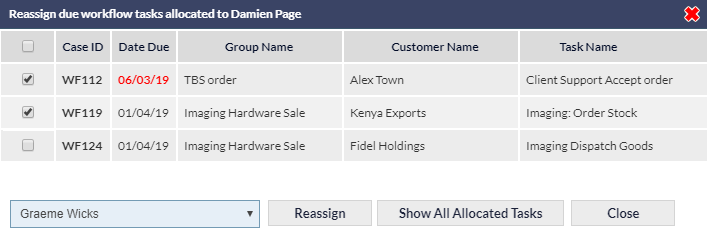 Tasks for reassignment can be selected by ticking the box in the left-most column of the relevant case row or, all Tasks assigned to the selected staff member can be selected by ticking the box in the left-most column header. The staff member to whom the task(s) will be reallocated should then be selected from the drop-down list at the bottom of the pop-out window; clicking the Reassign button will complete the process immediately.