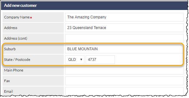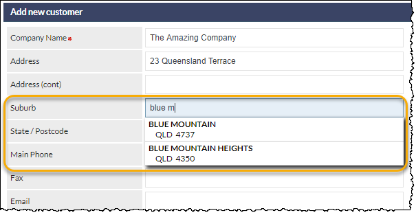 Click on the required Suburb to automatically complete the Suburb, State and Postcode fields: