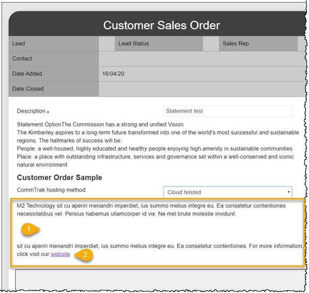 The previous image shows the Statement field type being used in a Data Sheet that has been created with the Template Toolkit, but it can also be used in Inline Data Sheets (i.e. those Data Sheets, which are completed within any Data Sheet section on a CommTrak page (e.g. a Lead, Telesales Opportunity, Data Sheet tab on Customer Screen).