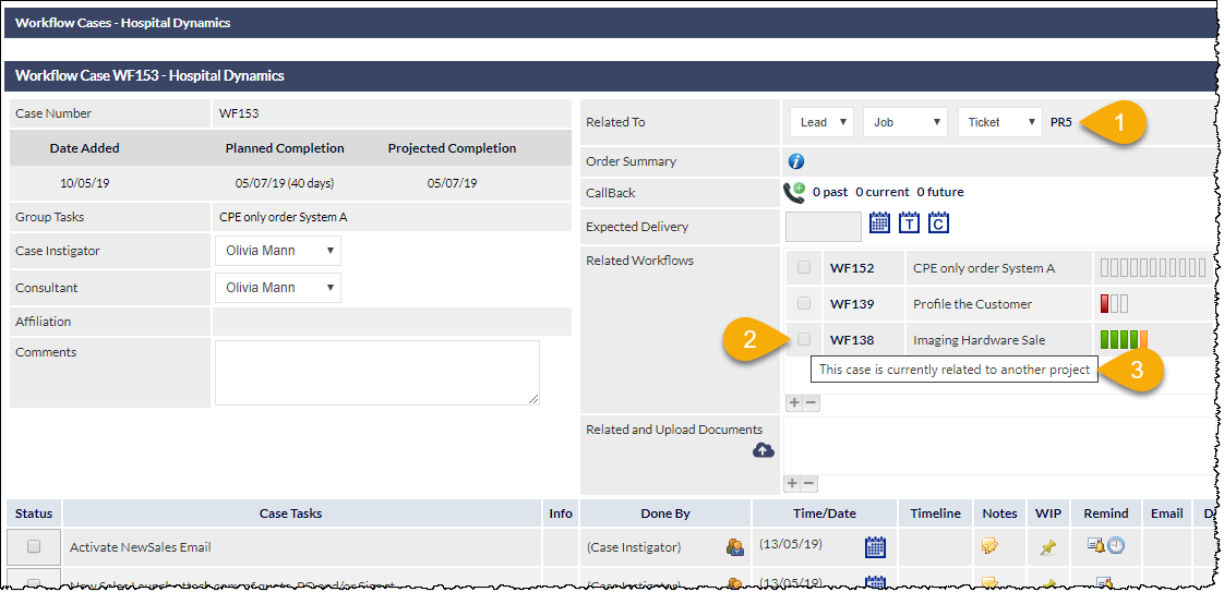 In the following image, we can see that the currently-displayed Active Workflow is related to PR5 (highlighted 1). We are unable to relate another Workflow that is related to a different Project; if we attempt to do so, we will find that the tick-box adjacent to the Workflow (highlighted 2) is disabled and, when the mouse hovers over the disabled tick-box, a tooltip is displayed advising that, This case is currently related to another project (highlighted 3).