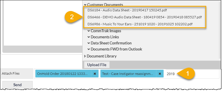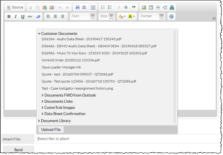 To select a document from either the Customer Documents or the Document Library, click in the blank area of the Attach Files field (i.e. on the Select files to attach hint); the drop-down list of documents (if any) will be displayed: