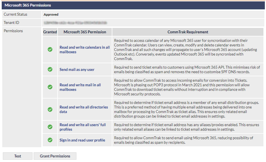 The permissions are required for CommTrak to integrate with Microsoft 365 to: