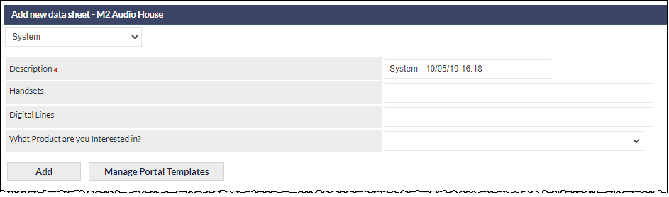 The following screenshot shows an example of a Data Sheet (named System) that has been selected, but not yet added. The example Data Sheet contains three text fields, and one drop-down selection field:
