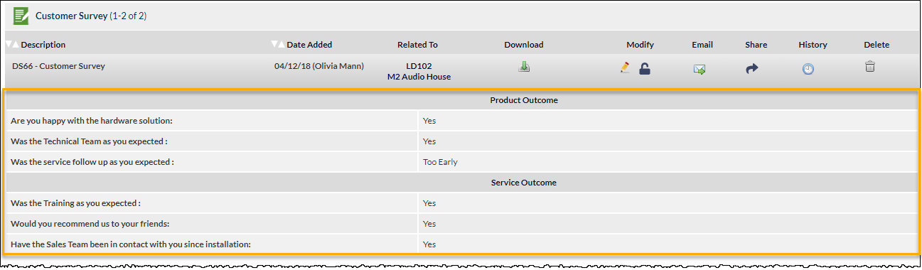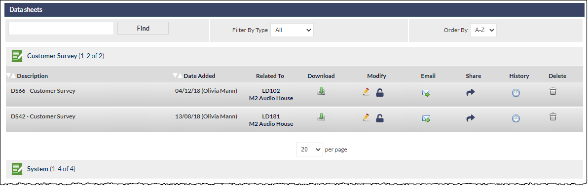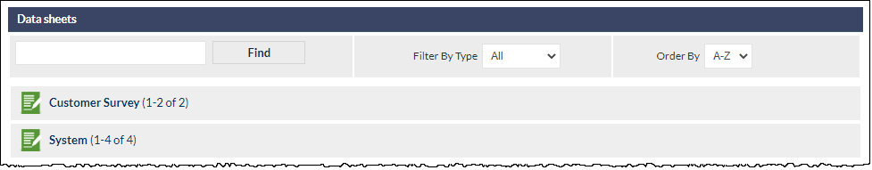 Each row represents a folder containing Data Sheets of a specific type. In the above example, only two types of Data Sheet have been completed ( Customer Survey and System).