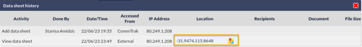 - Accessed from - where the Data Sheet was accessed; either CommTrak (for a signed-in CommTrak user), or External (when the access was by an external user, i.e. via a Data Sheet URL)