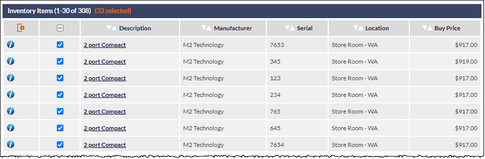 The Inventory Items section-header displays the number of inventory items shown in the list, compared to the total number of inventory items in your CommTrak. If items have been selected, by ticking the boxes adjacent to the items, the section-header also displays the number of selected items in orange text.