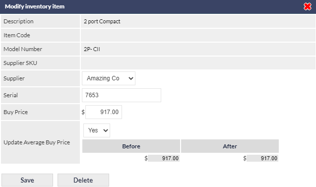 Clicking on an inventory item row, in the Inventory Items list, opens the Modify inventory item pop-up window for the selected inventory item, which provides features to either update or delete the inventory item: