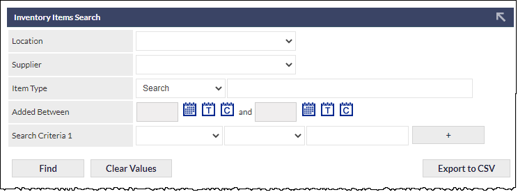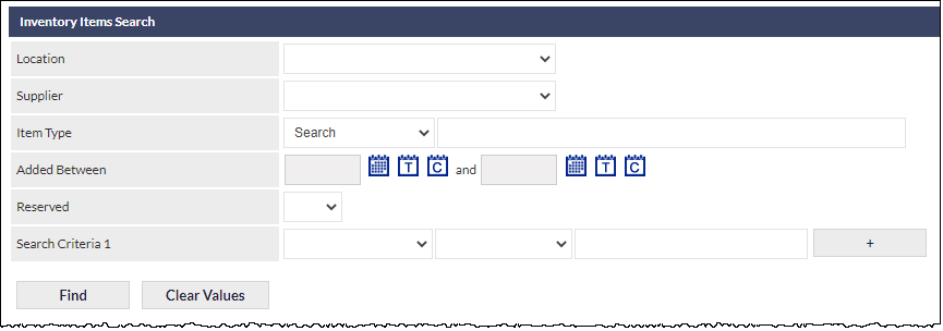 This section presents a number of criteria that can be specified for searching the Inventory database (with the results being listed in the Inventory Items section, at the bottom of the screen):