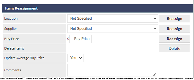 - Select one criterion for reassignment (i.e. select either the Location, Supplier or enter the new Buy Price)